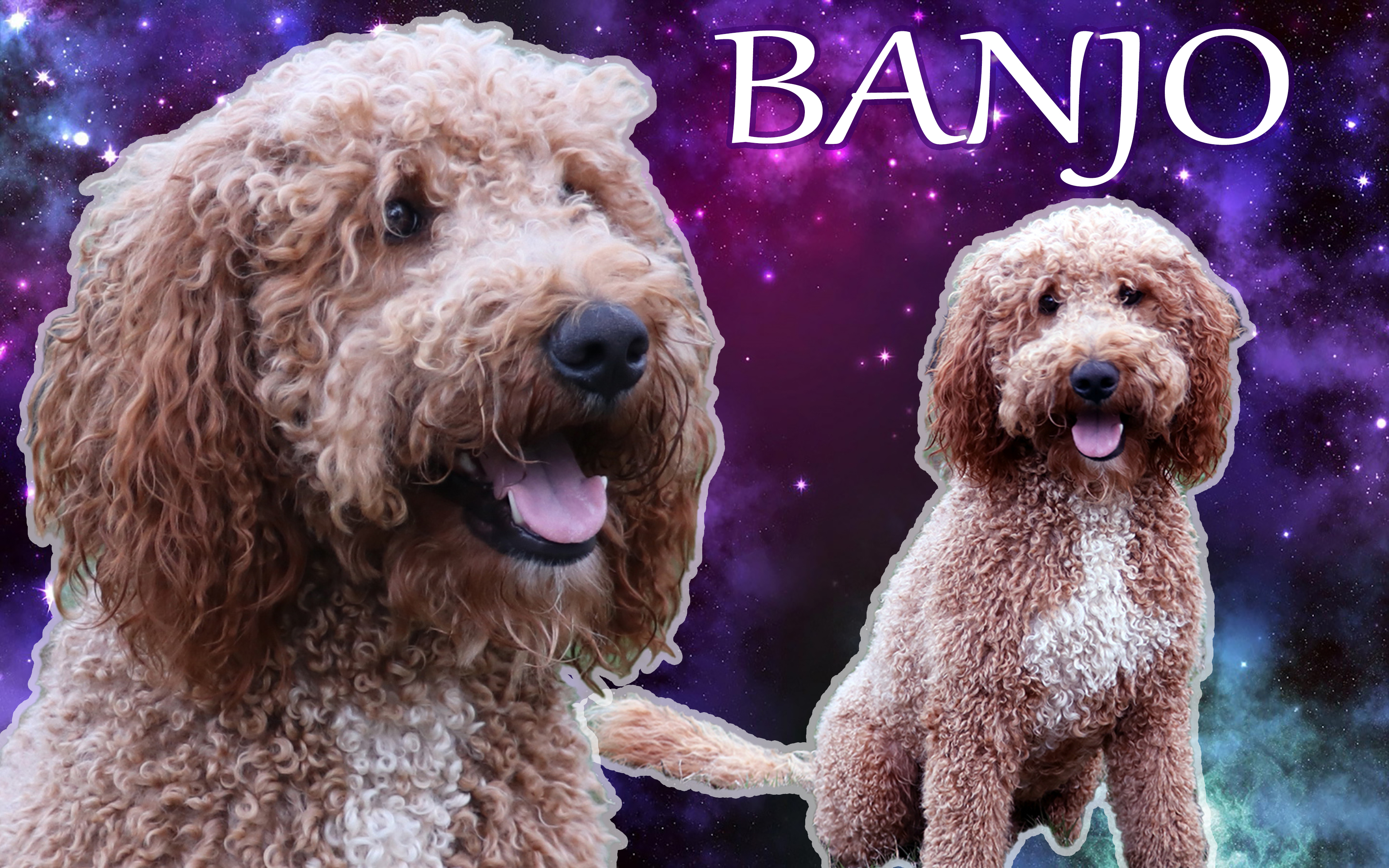 Banjo is a fully health-tested, AKC-registered Moyen Poodle (3/4 Standard Poodle, 1/4 Miniature Poodle) who weighs 40 pounds. He has a red and apricot coat with cream markings. Banjo loves everyone he meets and gets along very well with other dogs.