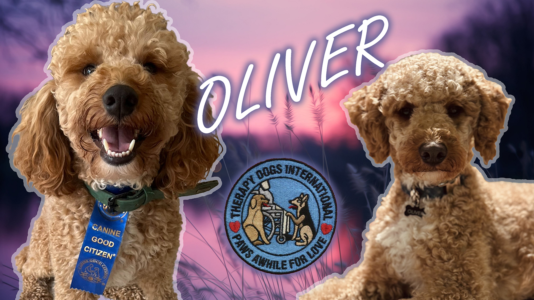 Oliver is a fully-health tested, 26 pound Moyen (medium-sized) Poodle with a red/apricot coat and cream markings. He is an AKC-registered Canine Good Citizen and a Certified Therapy Dog through Therapy Dogs International. Oliver is a very smart boy with a mellow, gentle personality.
