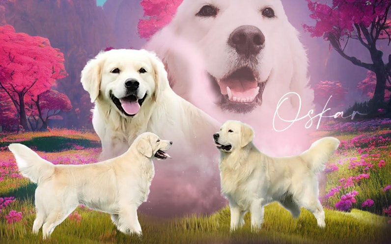 Oskar is a fully health-tested, AKC-registered English Cream Golden Retriever. He was imported from Ukraine as a puppy. Both of his parents are multi champions and his pedigree is full of other champions. Oskar weighs 75 pounds. He has an outgoing, class clown type personality and adores attention!